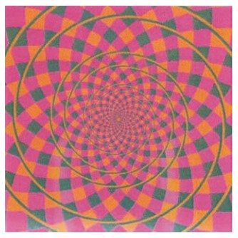 O fundo xadrez em direção ao centro é que ilude nossa visão nos fazendo interpretar a imagem dos círculos concêntricos como se fosse uma espiral. A chave para o segredo dessas imagens é deixar de olhá-las como um todo e focarmos os detalhes isoladamente como foi sugerido para desvendar o sorriso de Mona Lisa, ou seja, deixar de olhá-las com uma visão periférica e passar a olhá-las com uma visão central. A visão central nos permite ver os detalhes e a visão periférica nos permite uma visão mais ampla do que está à nossa volta.