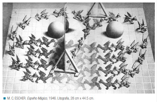É bem comum ouvirmos falar em imagem 3D. Mas você sabe o que é uma imagem em 3D? E como é possível enxergar em 3D? Quando olhamos um objeto bem de perto um olho vê com uma pequena diferença em relação à direção do outro, isso é o que nos faz ver a terceira dimensão, ou seja, com profundidade. Podemos reproduzir as três dimensões (altura, largura e comprimento) de um objeto qualquer em uma superfície de duas dimensões (altura, largura)? O desenho pode! Como? Por meio do uso do claro e escuro para dar ideia de profundidade e perspectiva. A imagem criada no plano bidimensional pode não ser tridimensional, mas pode produzir essa ilusão. Nessa obra de Escher, Espelho Mágico, não se vê apenas a reflexão de uma imagem no espelho representada pelo desenho, vemos essas imagens saírem de um plano bidimensional para um plano tridimensional. As figuras ganham vida, parecem sair do papel e se multiplicam como nas reflexões da imagem do caleidoscópio.