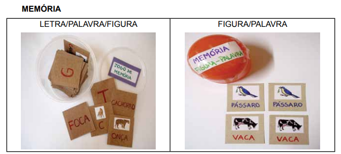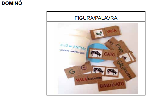 Esse jogo também é comum entre as crianças dessa faixa etária e pode ter variações em suas cartelas, desde que contemplem os símbolos das figuras referentes ao tema do jogo, ou seja, se o tema proposto refere-se a animais (vaca, cachorro, gato e galo), além das figuras desses animais, as cartelas poderão conter as palavras e letras correspondentes a elas. Com isso, o desafio constitui a identificação e a correspondência dos elementos que representam o objeto (imagem), envolvendo possibilidades que a criança poderá perceber no decorrer do jogo.