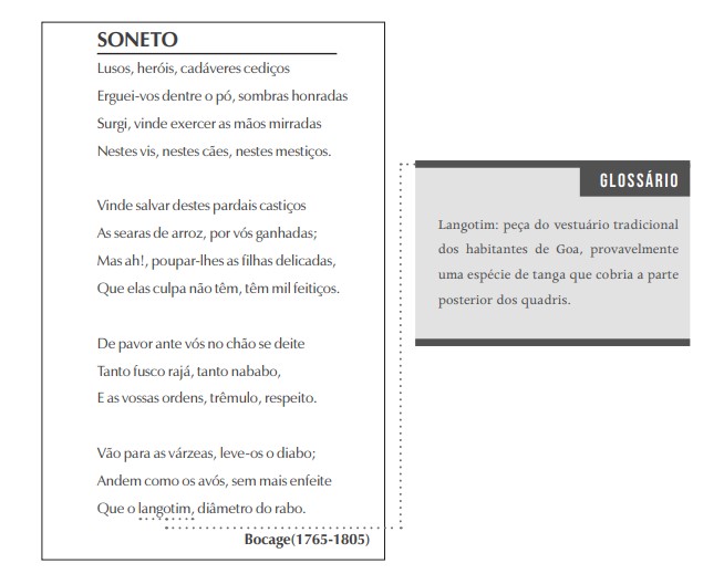 Bocage também faz exaltações à mãe de Cristo, revelando a forte característica da época, em que Estado e religião caminhavam de mãos dadas. Era boêmio e foi encarcerado em várias prisões portuguesas. O soneto apresentado retrata a pretensa superioridade europeia dos portugueses diante das suas colônias. Observe que ele trata os nativos como “vis”, “cães” e “mestiços”.