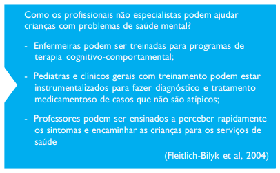 Mesmo quando é possível encaminhar a criança para um especialista em saúde mental, o profissional de saúde generalista precisa saber reconhecer os sintomas e o prejuízo que causam ao cotidiano da criança, para melhor entenderem e acompanharem seus pacientes. Infelizmente, muitas vezes os profissionais não contam com apoio de especialistas em saúde mental nem para discutir os casos.