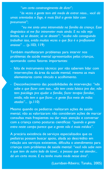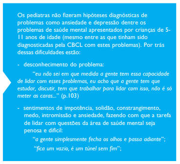 Estudo com pediatras de Unidade de Atenção Básica em São Paulo ilustra o distanciamento mostrado pelos profissionais de saúde em geral ao lidar com crianças com transtornos mentais. Pediatras fizeram hipóteses diagnósticas de saúde mental em apenas uma entre cada quatro crianças aferidas com problemas de comportamento pela escala CBCL (Lauridsen-Ribeiro; Tanaka, 2005).