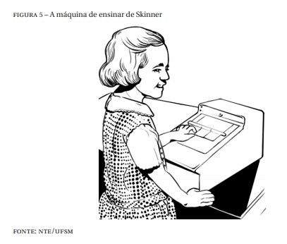 Quando Skinner fez esta proposição, a tecnologia não era tão avançada como nos dias de hoje. Observe a Figura 5 e veja uma das primeiras máquinas de ensinar, apresentada em 1954. Atualmente, muitas escolas fazem uso de computadores com uma proposta semelhante à do autor.