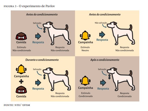 Utilizando um equipamento adaptado ao seu estudo (Figura 3), Pavlov analisou o processo de salivação dos cães. Descobriu que era possível fazer com que um estímulo antes neutro (um som, por exemplo) provocasse salivação ao ser associado a um estímulo que gerava naturalmente essa reação (a comida) (CAMPOS, 2014; MATOS, 1993).