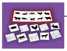 Painel feito de papelão plastificado, medindo 55cm x 25cm. Em uma das faces do painel há duas fileiras horizontais, com silhuetas negras de animais: porco, pato, macaco, galo, coelho, cavalo, rato, gato, cachorro e vaca. Na face oposta, há só o contorno das mesmas figuras. Envelope com dez retângulos transparentes de 10cm x 10cm com o contorno das figuras, do mesmo tamanho.