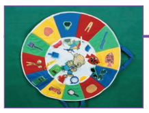 Painel circular, feito de tecido macio, acolchoado e colorido, com 80cm de diâmetro. Em toda a volta há 12 bolsos nas seguintes cores, intercaladas: amarelo, azul, verde e vermelho. Em cada bolso, há um objeto de uso comum ou um brinquedo com o qual a criança pode interagir: pentear, cortar, dar corda, apertar. Um deles é sonoro. A figura de cada brinquedo está estampada na frente do respectivo bolso. No centro do painel há a figura de um alegre ursinho que segura um barbante preso a uma pipa que adere ao painel por meio de velcro. O painel possui duas alças e, quando dobrado, vira uma bolsa triangular.