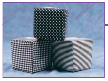 Três cubos feitos de espuma, com 12cm de lado, revestidos com tecidos de cores contrastantes, preto e branco, sendo um cubo de listas, um xadrez e o outro de bolas. Na lateral de cada cubo há uma faixa de velcro, para prender um ao outro. No interior dos cubos há um guizo, que produz som quando eles são agitados.