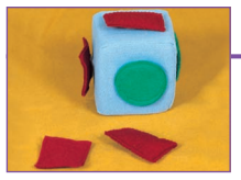 Cubo feito de espuma, medindo 10cm x 10cm, leve e revestido de tecido macio. Em cada face do cubo existe uma aplicação de velcro onde se prende uma figura geométrica bidimensional feita em feltro colorido; são três pares de figuras diferentes. No interior do cubo existe um guizo que produz som.