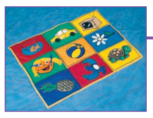 Painel feito em tecido macio, acolchoado, medindo 64cm x 82cm, composto de nove retângulos de cores vivas, medindo 17cm x 20cm. Cada retângulo contém uma atraente figura de animal, brinquedo ou objeto. Alguns retângulos possuem elementos táteis, removíveis ou sonoros: um peixinho que pode ser retirado do aquário, as rodas do carro que podem ser giradas, a televisão com botões que podem ser rodados, o relevo encontrado na casca do abacaxi, uma bola que, ao ser pressionada, produz som, uma ave com asas soltas, uma tartaruga presa com velcro.