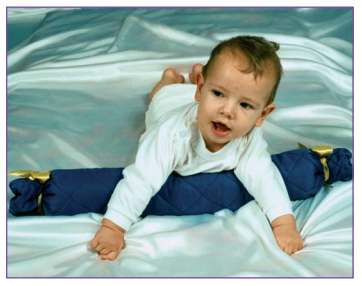 Colocar o bebê de bruços, com o peito apoiado sobre o rolo, deixando as mãos livres para brincar. Colocar brinquedos ao seu alcance e chamar a atenção para eles. Ficar na frente do bebê, em posição mais elevada, e agitar um chocalho ou brinquedo sonoro para que ele erga, sustente e gire a cabeça, fortalecendo os músculos do pescoço e peito e desenvolvendo o