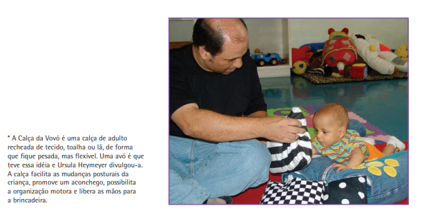 Colocar uma das almofadas no berço ou em local onde o bebê possa vê-la facilmente; ajudar o bebê a encontrar a almofada, agarrá-la, batê-la e manuseá-la. Segurar uma almofada na frente do rosto do bebê, deslocando-a da direita para a esquerda, para cima e para baixo, distanciando e aproximando; incentivar o bebê a acompanhá-la com o olhar. Balançar a almofada para produzir som e chamar a atenção também para o aroma. Colocar o bebê de bruços e sob seu peito pôr o Rolinho ou a Calça da Vovó*.