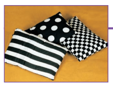 Kit contendo três almofadas, recheadas de material leve e macio, medindo cada uma 25cm x 35cm. São revestidas em tecido de algodão, com cores contrastantes, preto e branco, sendo uma listada, uma xadrez e a outra de bolas. As almofadas trazem em seu interior elementos sonoros e substâncias aromáticas.