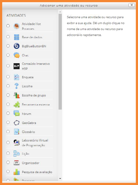2. Atividades: são ferramentas destinadas à avaliação e à comunicação – Chat, Fórum, Glossário, Questionário, Tarefa, Wiki, entre outras.