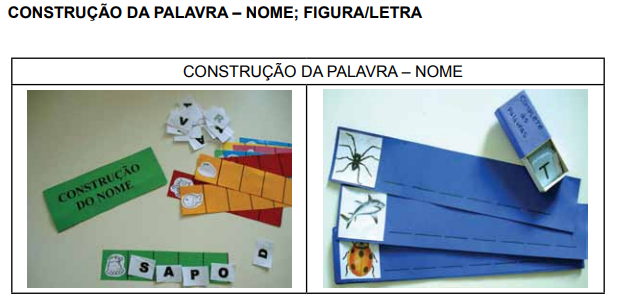Uma variação dessa proposta seria apresentar uma quantidade de figuras e o alfabeto móvel, dentre eles, a criança retira uma carta contendo uma figura e com o alfabeto móvel, constrói sua hipótese.