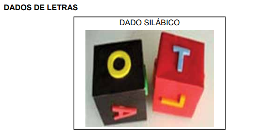 Esse jogo propõe que, ao jogar os dados, a criança parta do som formado pela junção das letras (unidade silábica) para identificar uma palavra que inicie com esse som. As variações do jogo dependem dos desafios que o professor considerar pertinentes. Pode-se propor um dado e a letra que cair será a letra inicial da palavra, ou fazer parte da palavra em outra posição e, ainda, pode-se considerar válida a sílaba no meio da palavra.