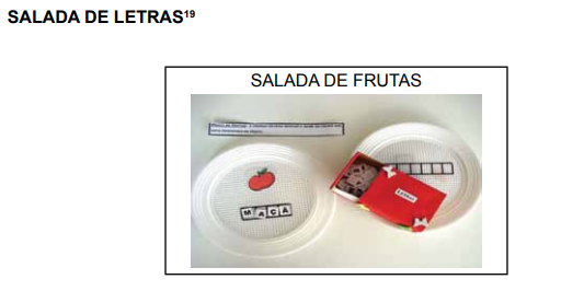 - Jogos de linguagem: a organização dos grupos deve seguir os critérios determinados na metodologia, considerando os conhecimentos prévios das crianças para a escolha dos jogos, que devem ser diferentes em cada grupo. Os jogos podem ser propostos duas vezes por semana ou semanalmente, de acordo com o planejamento do professor. Inicialmente, no 1º ano, as peças devem conter figura/foto para favorecer a identificação e discriminação visual. Letras e palavras devem ser escritas em caixa-alta, principalmente para o 1º e 2º anos, com traçado bem definido e compor com as figuras que representam. No máximo 40 peças. Exemplos de jogos: bingo (figuras/letras/palavras), memória (figura/letra/palavra), dominó (figura/letra/palavra), monta e desmonta (figura/alfabeto móvel), salada de letras (figura/alfabeto móvel), dado de letras (vogais/ consoantes), textoteca (acervo de diferentes tipos de textos: receita/descritivo/poesia/literário; versinhos/cantigas/parlendas/adivinhas), iconoteca (acervo de imagens diversas: paisagens/animais/objetos/pessoas), trilha de letras (tabuleiro com letras/ dado), trilha das vitaminas (tabuleiro com informações escritas e figuras/dado) acervo de fichas de palavras-chave (palavras/figuras) e construção do nome (ficha com figura e espaços das letras/alfabeto móvel).