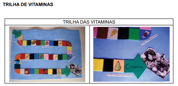 - A seguir, conforme o número jogado, a criança deverá andar as casas da trilha e, sempre, ao encontrar uma fruta ou verdura, escreverá o nome dela e pulará três casas; se encontrar uma guloseima, voltará duas casas.