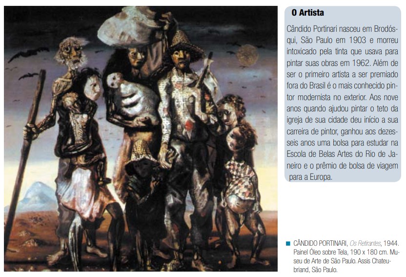 Portinari, voltado aos problemas sociais do país, pintou quadros sobre a fome, a seca, a pobreza, o trabalho e as injustiças. Observe sua obra Os Retirantes: