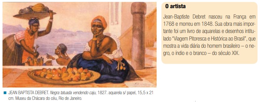 Debret, em várias de suas aquarelas, registra a presença maciça do negro realizando diferentes atividades na cidade do Rio de Janeiro. As cores na obra Negra tatuada vendendo caju são mais intensas no tema central, enquanto que no restante da obra, utiliza cores mais suaves, diluídas ou esmaecidas. Sua aquarela tem um horizonte e montanhas em suaves azuis e amarelos. Porém, a negra que está vendendo cajus, é representada com cores mais fortes e intensas.