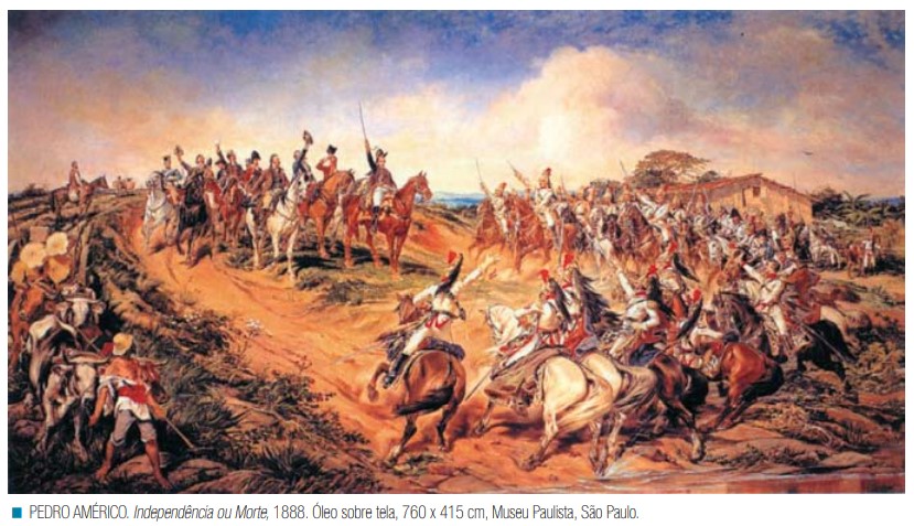 Esse quadro retrata realmente o que aconteceu? D. Pedro I está no centro, empunhando uma espada direcionada para o alto em um gesto heroico e, provavelmente, gritando a célebre frase: “Independência ou Morte! ”. Na sua opinião, um grito pode proclamar a independência de um país ou essa independência depende de outros fatores? E quais fatores seriam esses? A autonomia de um país se constrói constantemente, e é necessário que as pessoas se sintam livres para criar sua própria cultura. Não se domina um país apenas pela invasão do seu território, porém, principalmente, pela incorporação de repertórios culturais e sociais estrangeiros e a secundarização da cultura nacional. O quadro Independência ou Morte, nesse caso, é exemplar, pois é uma pintura no estilo Neoclássico importado pela Missão Artística Francesa, que chegou no Brasil em 1816.