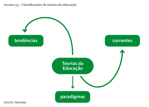 Na literatura internacional e nacional podemos ainda encontrar algumas classificações das teorias da educação, ora chamadas de tendências ou correntes, ora de paradigmas, conforme Figura 52.