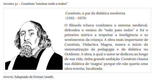 Comênio, Figura 51, lança em 1657 o lema do “ensinar tudo a todos” e, não por acaso, é considerado o embaixador da educação moderna (FERRARI, 2008). O movimento iluminista do século XVIII fortalece essa ideia de formação geral, válida para todos os homens, como condição de emancipação e esclarecimento (LIBÂNEO; SANTOS; SAVIANI, 2005).no ano de 1926 (OLIVEIRA, 1993).