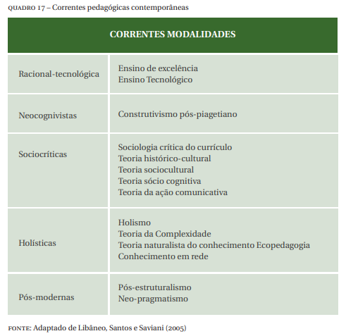 Em outra orientação, dir-se-á que os campos científicos em geral firmam-se muito por conta de legitimação das concepções por meio de disputa de poder (LIBÂNEO; SANTOS, 2005). Ainda segundo os autores, há ainda posições que deliberadamente defendem o hibridismo cultural. Na verdade, as classificações sempre existiram, independentemente das críticas que lhes são feitas, elas pertencem sim a certa tradição da racionalidade científica. Eles também apresentam o esboço de um quadro geral das correntes pedagógicas contemporâneas, proposto a seguir, conforme Quadro 17.