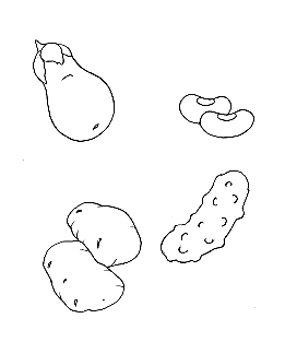 Desenho de Berinjela, Feijão, Batata e Picles para imprimir e colorir de forma divertida.