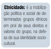 Etnicidade… O que é isso? Na nossa vida social cotidiana, muitas vezes, deparamo-nos com notícias de grupos étnicos lutando e reivindicando algo na sociedade, tanto no âmbito econômico ou político, como ocorre com os índios e os negros. As várias etnias indígenas se unem em prol da luta pelos direitos de suas terras. Não se trata de direitos à igualdade de distribuição de renda ou de Reforma Agrária, mas, sim da posse legítima que os índios têm das suas reservas de terras.
