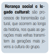 descobrir as características físicas e de personalidade que herdamos de nossos antepassados, podemos reconstruir a trajetória histórica cultural de nossas famílias. E a partir dos dados históricos, entendermos a herança social e todo nosso legado cultural. Um exemplo desse processo social de transmissão de cultura é a educação ou criação familiar. A cada geração vai se transmitindo, ou melhor, ensinando aos filhos e jovens certos conhecimentos e valores morais adquiridos pela geração mais velha.