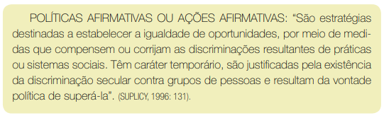 Outro exemplo de etnicidade e mobilização é a luta pela igualdade de oportunidades no trabalho e na educação, distribuição de renda, contra a discriminação étnica-racial (racismo), etc., que os negros travam no Brasil. As cotas, termo que também faz parte das chamadas Políticas Afirmativas, são medidas positivas, que buscam reparar ou minimizar o racismo e a exclusão social que afetam os negros e descendentes retirando as oportunidades de ingresso nas universidades e nos concursos públicos.