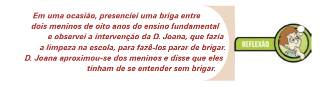 Após conversar com os dois, e cada um dizia que era culpa do outro, D. Joana, tranquilamente apenas disse que não queria saber de quem era a culpa. Se os dois estavam brigando, então os dois tinham de parar. Os meninos pararam e cada um foi para o seu lado. Vamos pensar um pouco sobre o que aconteceu. O que D.