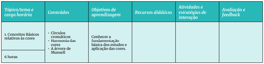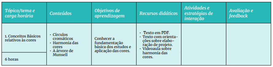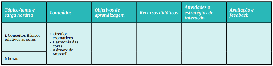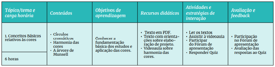 Definição dos tópicos temas principais referentes aos conteúdos que serão abordados nas aulas, bem como a carga horária prevista para o estudo de cada tópico, considerando todas as atividades propostas aos estudantes, como leituras, vídeos, tarefas, participação em fórum e em webconferência etc.