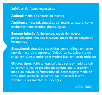 Pode ter ataques de pânico diante do objeto que causa medo. É comum que crianças tenham medos de objetos ou situações, mas o diagnóstico de fobia específica só é dado quando o medo interferir seriamente no cotidiano da criança, em sua vida social e escolar, por um período mínimo de seis meses.