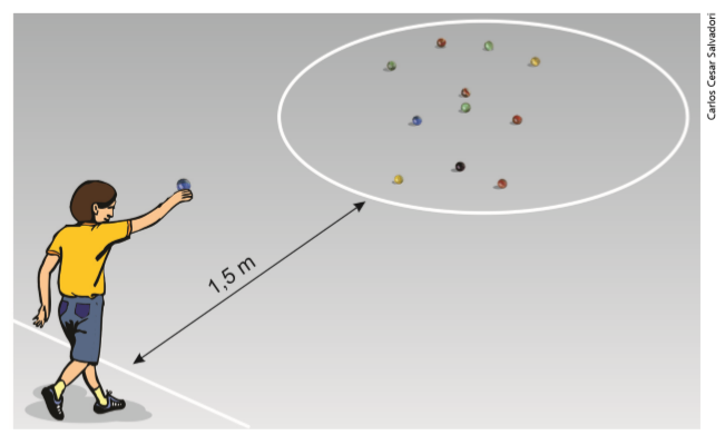 – Cada aluno, na sua vez, lança a bolinha de gude maior (ou de outra cor) em direção às bolinhas de gude que estão no círculo.