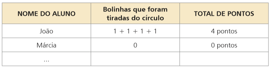 Essa forma facilita a comparação e análise dos resultados, que podem ser problematizados, com questões do tipo: Quem fez mais pontos? Quantos? Qual é a menor pontuação conseguida? Qual a diferença de pontos entre um jogador e outro? Extrapolando os resultados obtidos durante o jogo, é possível propor questionamentos do tipo: Se, em uma jogada, um aluno conseguisse tirar todas as bolinhas de gude do círculo, quantos pontos faria? Se um aluno fez 7 pontos, quanto falta para esse aluno fazer 12 pontos?