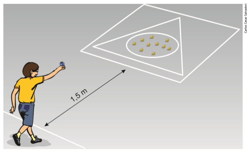 Pode-se ressaltar o que diferencia cada uma das figuras umas das outras. O quadrado é diferente do triângulo, pois possui quatro lados. Ambos são diferentes do círculo, pois são compostos de linhas retas. Outro aspecto a ser destacado é a distância entre a linha de lançamento da bolinha de gude até o esquema do jogo, que pode ser de aproximadamente um metro e meio (150 cm). Isso corresponde a quantos passos?