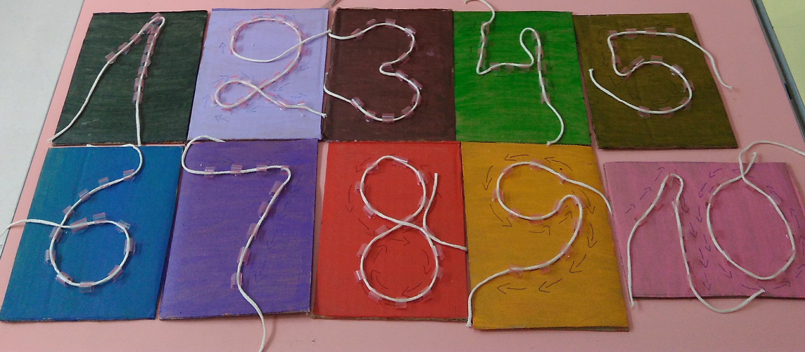 Preparação do Papelão: Pinte cada pedaço de papelão de uma cor diferente. Após a secagem, escreva os números de 1 a 10 em cada um, utilizando uma caneta com tinta permanente.