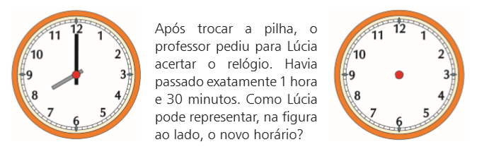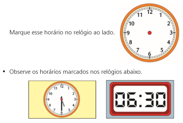 – Após os alunos marcarem o horário solicitado, eles apresentam a resposta. O horário pode ser mostrado, também, pelo professor no quadro de giz ou na lousa ou, no caso de marcação em relógio de ponteiros, em um relógio de parede.