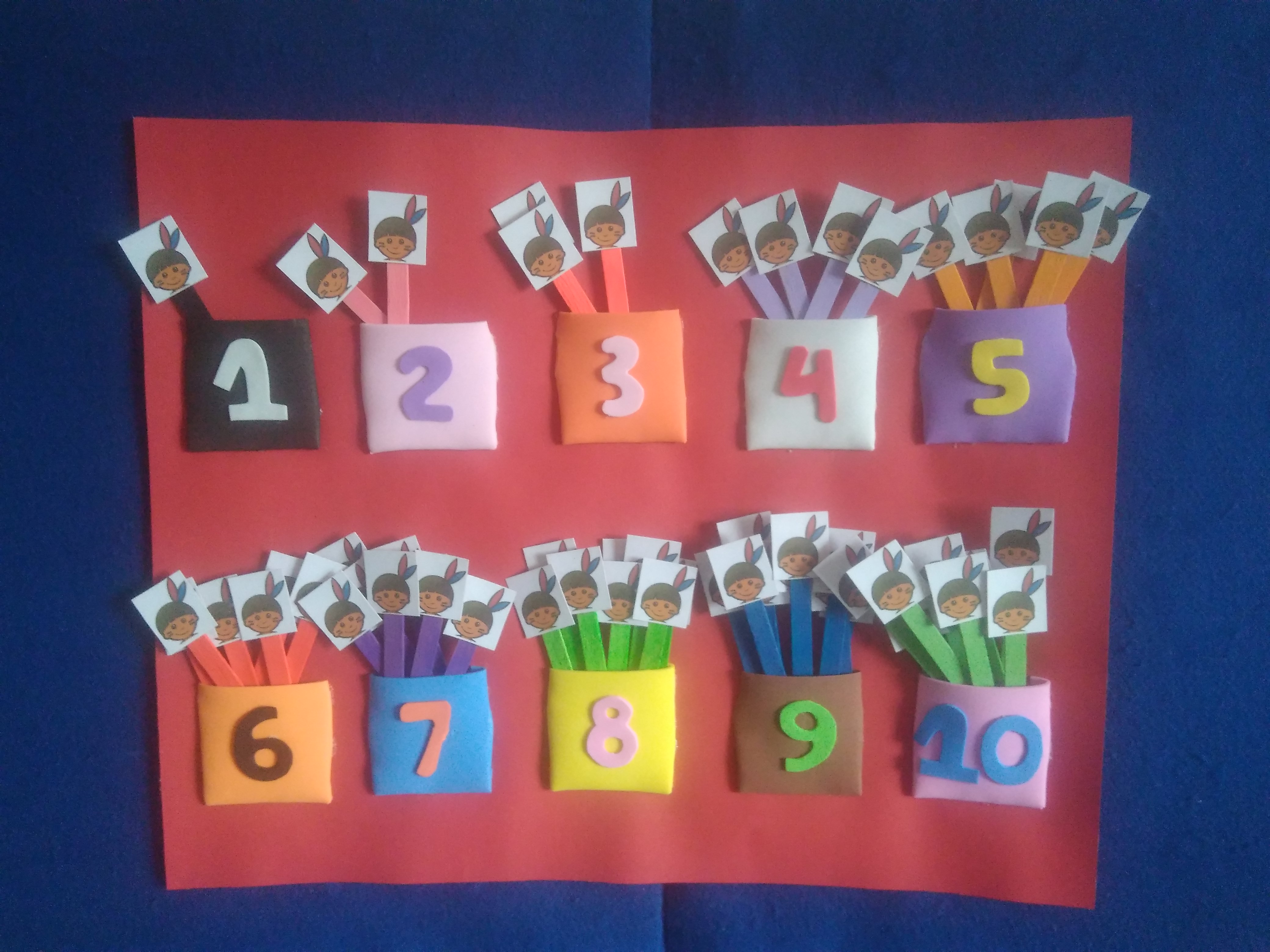 O jogo que confeccionei consiste em um painel com numeração de 1 a 10, utilizando o tema “indiozinhos”. Para iniciar a atividade, sugerimos que as crianças cantem a música dos indiozinhos e, conforme cada número de índios for citado na canção, demonstrar a quantidade correspondente de índios presentes no painel.