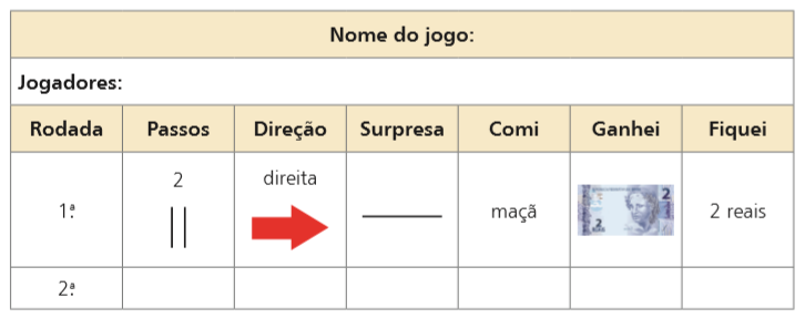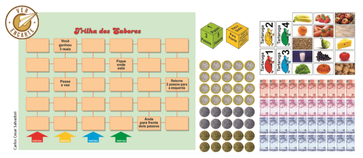 – 1 tabuleiro médio com trilhas (em alguns espaços da trilha existem elementos surpresa, tais como: passe a vez, fique onde está, retorne 2 passos para a esquerda, você ganhou 3 reais, entre outros) Obs.: O professor poderá desenhar esse tabuleiro em uma folha de papel maior (bobina, craft ou pardo)