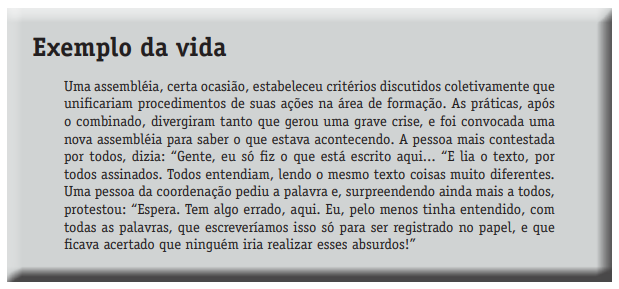 Combinamos muitas coisas nas nossas assembléias, e cada um entende coisas muito diferentes dos mesmos signos escritos. Fantasia, imaginação, construção a partir dos sentidos cotidianos de nossas experiências, fazem circular ideias muito contrárias nas mesmas palavras.