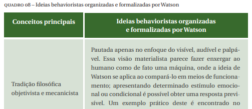 A psicologia deveria ser puramente objetiva, uma ciência natural e experimental, investigando o comportamento tanto humano quanto animal. Essa reflexão é importante salientar, visto que uma das metas dessa corrente é a previsão e controle do comportamento de modo geral. As ideias do behavior já haviam sendo desenvolvidas aos poucos, ou seja, não foi exatamente criada por Watson, mas sim organizada e formalizada por ele. (REMOR, 2016, s/p.)