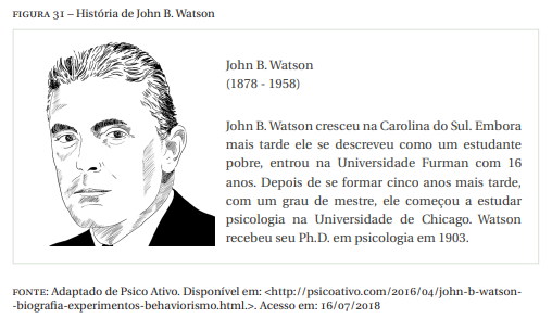 O principal líder do movimento da nova teoria foi John B. Watson, que rejeitava todo e qualquer conceito mentalista, assim como as introspecções a respeito da existência da consciência eram para ele, irrelevantes. Segue a Figura 31 onde é relatado uma breve história da vida de John B. Watson.