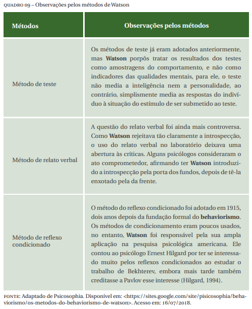 Ainda segundo Remor (2016, s/p.), Watson procurando ajustar métodos e aperfeiçoar a natureza científica à necessidade “insistiu que era preciso limitar-se ao estudo objetivo do comportamento com métodos de investigação rígidos”. Logo, ele então incluiu a observação pelos métodos, conforme Quadro 09.