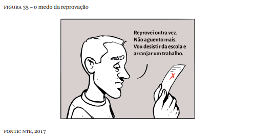 A figura exemplifica o medo da reprovação e a autossugestão de que a escola não é o lugar de reprovados.