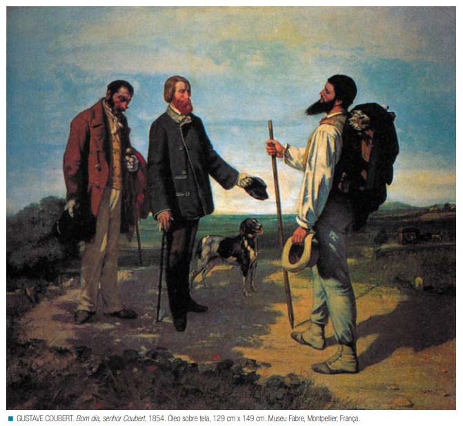 Enquanto o Surrealismo trata dos sonhos e do imaginário, o Realismo de Courbet, por exemplo, tem por objetivo revelar os aspectos mais característicos e expressivos da realidade “nua e crua”, sem enfeites. Observe a obra, Bom dia, senhor Courbet, que mostra uma cena com realismo e uma franqueza, na qual o artista se representou de bengala e mochila no momento em que seu anfitrião veio ao seu encontro na estrada, com um criado e um cachorro. (STAHEL, 1999, p.111