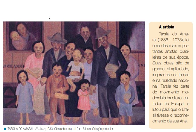 Muitos artistas brasileiros também retrataram a realidade social dos trabalhadores. A obra de Tarsila do Amaral é um exemplo disso. Essa obra apresenta uma cena comum. A obra 2ª Classe retrata a situação das pessoas que são obrigadas a viajar numa condição inferior a uma outra, de “primeira classe”, exclusiva da elite. Na busca da realização do sonho de melhores condições de vida, muitas pessoas deixam o campo e vêm para a cidade.