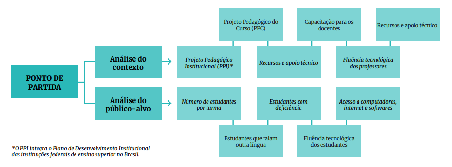A figura abaixo (ponto inicial do planejamento pedagógico para o ensino não presencial ou híbrido em uma IES) apresenta alguns fatores de grande importância a serem considerados.