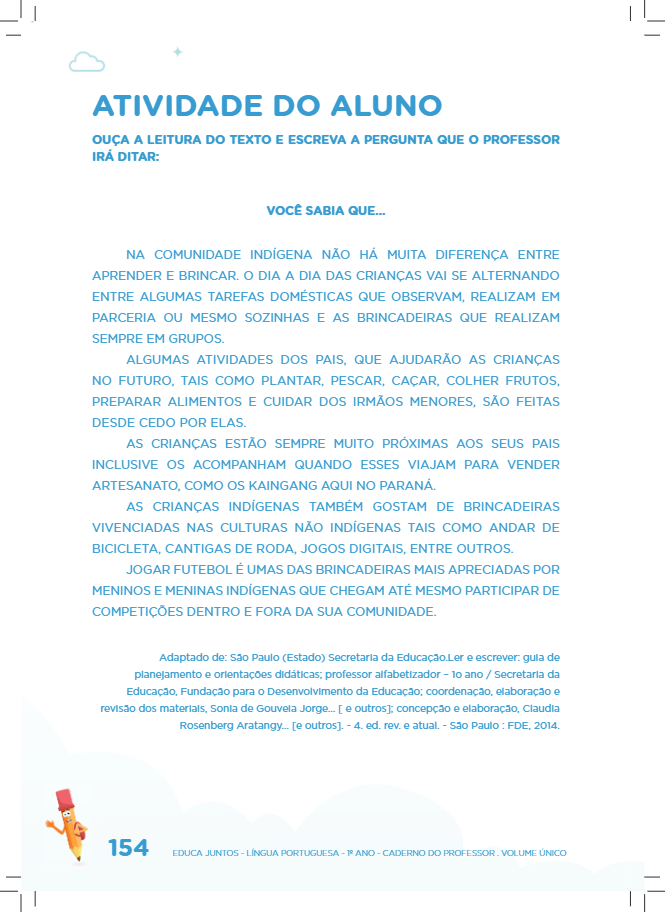 - Retome com as crianças as informações e sugira que este texto inicie com uma pergunta. Você pode perguntar-lhes: Do que fala este texto? Se você fosse perguntar a uma pessoa se ela conhece o assunto desse texto, como perguntaria? A sugestão de pergunta é: “Vocês sabiam que…Na cultura indígena não há muita diferença entre aprender e brincar? Ou “Você sabe como é o dia a dia das crianças indígenas? ”; mas as crianças poderão pensar em outras perguntas que sejam coerentes para o texto.